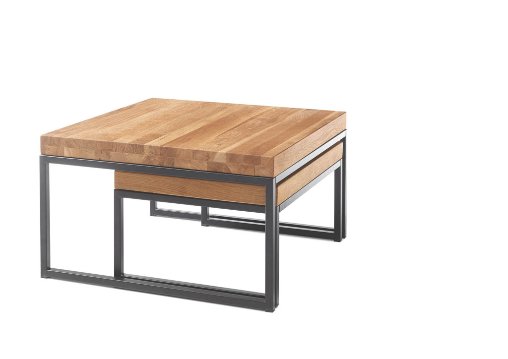 Set, Asteiche massiv, geölt, Holzwerkstoffplatte MDF RAL 9005, Gestell Metall schwarz, pulverbeschichtet RAL 9005, Tisch 1 Deckplatte Asteiche massiv, geölt, BHT ca. 65/38/65 cm, Tisch 2 Tablett fix montiert, einseitig schwarz lackiert, LBH ca. 57/45/30 cm, LBH ca. 65/65/38 cm, max. Belastbarkeit 15kg