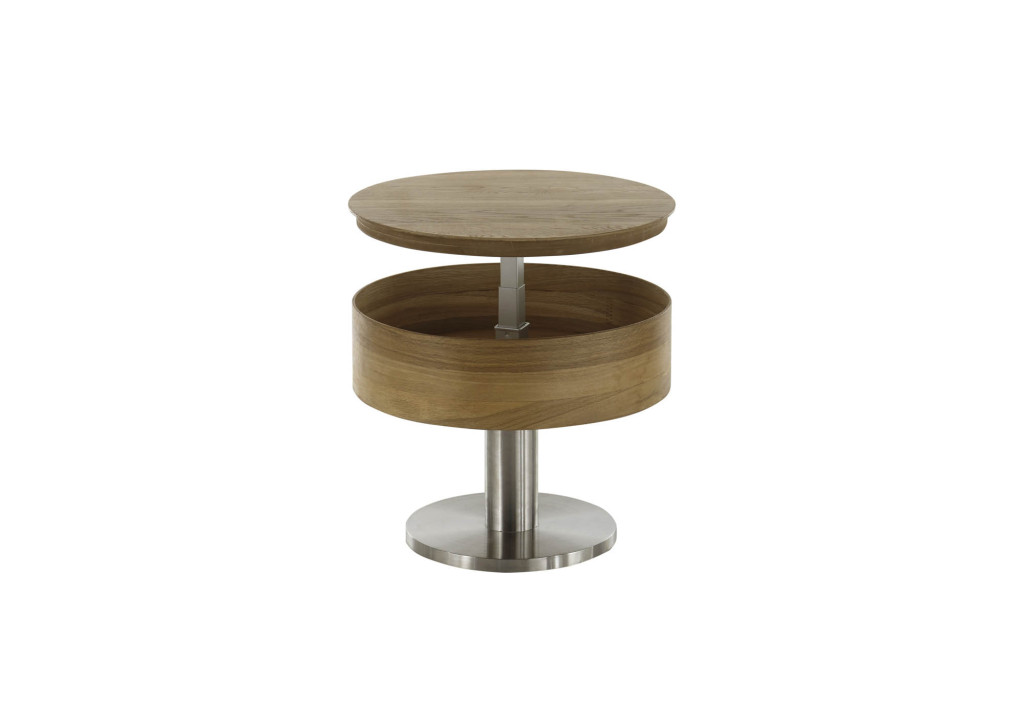rund 60 cm, Asteiche furniert Schichtholz und Spanplatte, geölt, Kastenhöhe ca. 17 cm, Gestell Metall Edelstahl-Optik, Höhe 47 cm, stufenlose Höhenverstellung bis 65 cm, Belastbarkeit bis maximal 15 kg, Rollen unter der Bodenplatte, DH ca. 60/47 cm