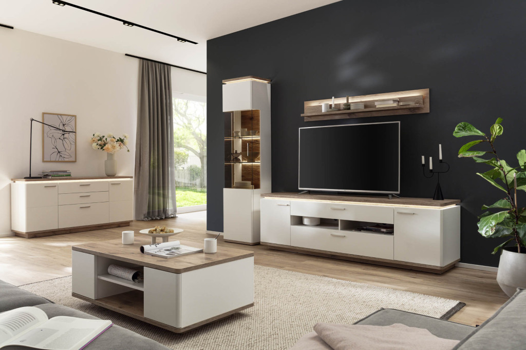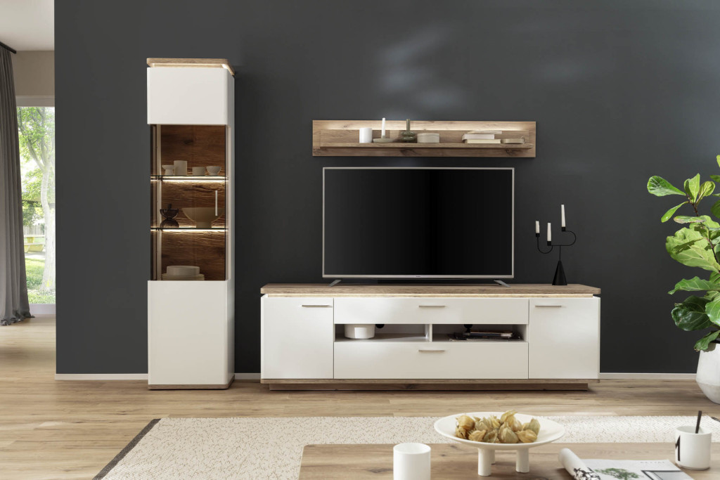 Front Soft white tiefgezogen Nachbildung, Korpus Soft white Melamin Nachbildung, Korpusabsetzung Viking Oak Melamin Nachbildung, Seitenverglasung Parsol braun, Glasböden Klarglas, Rückwand sichtbar 3D Viking Oak Nachbildung geschroppt, Rückwand hinter Türen + Schubkästen Soft white Nachbildung, Griffe Metall nickel matt, Schubkasten Unterflurführung gedämpft, Kombination W02 bestehend aus: T12 - Kombi-Vitrine, 2-türig, 1 Tür mit Glas, LED Beleuchtung Oberboden inklusive, Seitenverglasung rechts, BHT ca. 75/208/38 cm T30 - TV-Element, 2-türig, 2 Schubkästen, 2 Fächer, BHT ca. 210/65/50 cm T50 - Wandboard, 1 Paneel, 1 Boden, BHT ca. 150/24/19 cm Gesamtmaß BHT ca. 295/208/50 cm