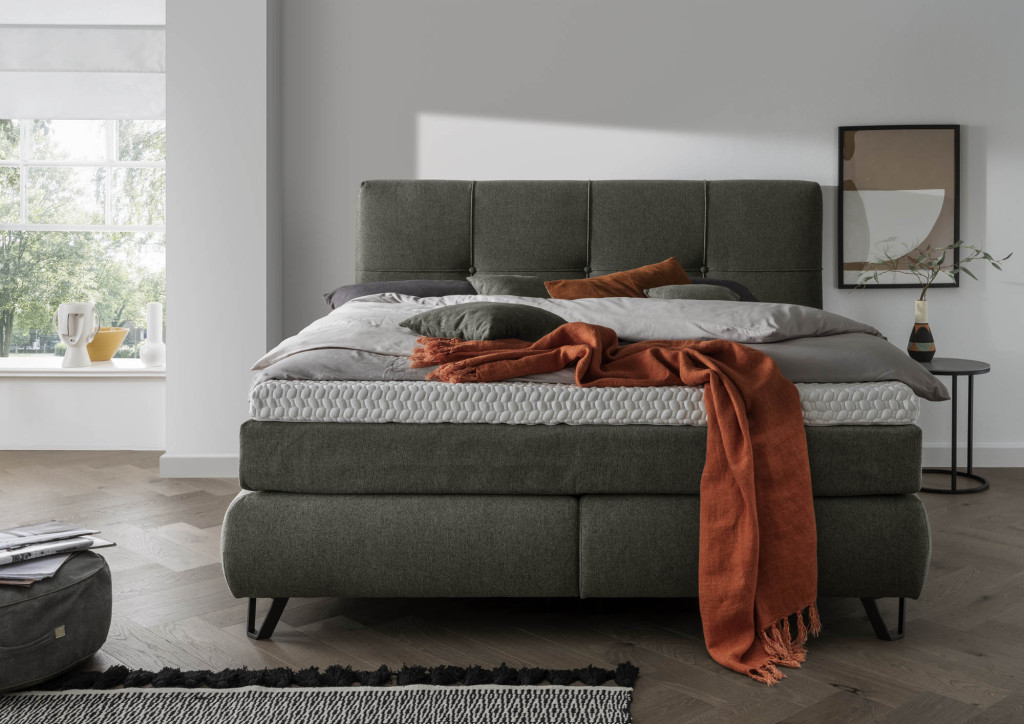 Stoff 7078 grau, Füße Amore schwarz metall, Liegefläche 180x200cm, Box Premium mit TFK u. Halbrundschaum, 7-Zonen Taschenfederkernmatratze H2 (ca.390 Federn bei Größe 100/200 cm), Partnerbezug mit Spiegel, Karogestepptes hochwertiges Kopfteil, inklusive Topper Twin 10 cm, 4 cm Gel- u. 4 cm LLQ-Schaum