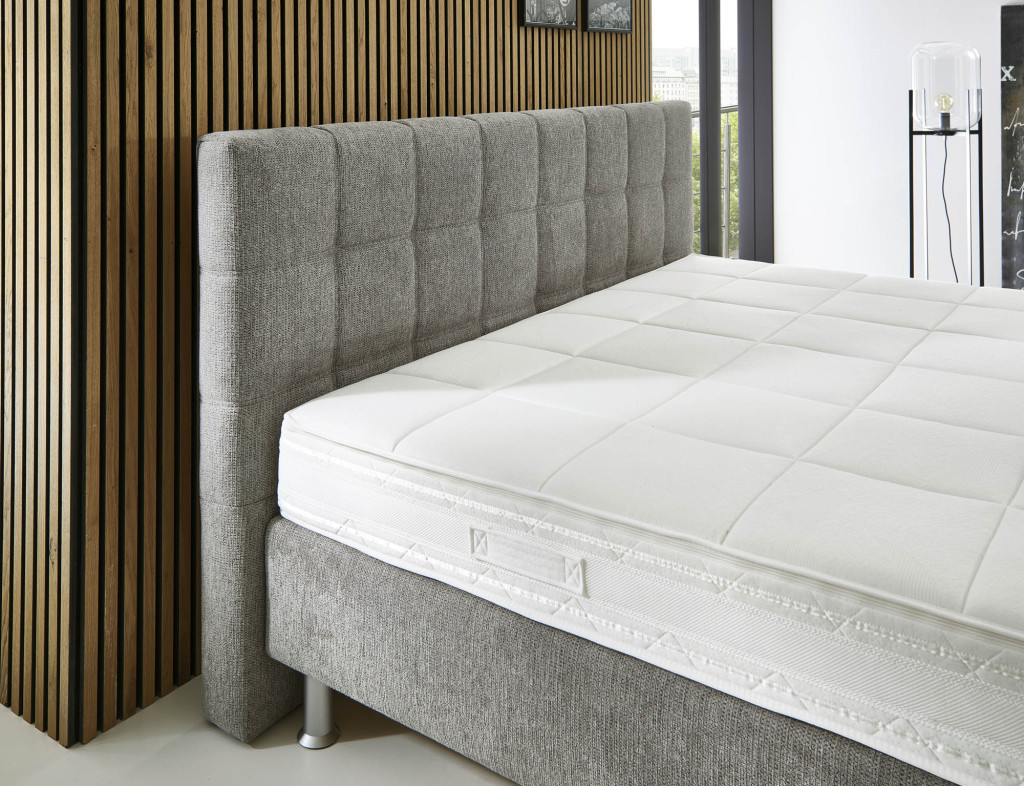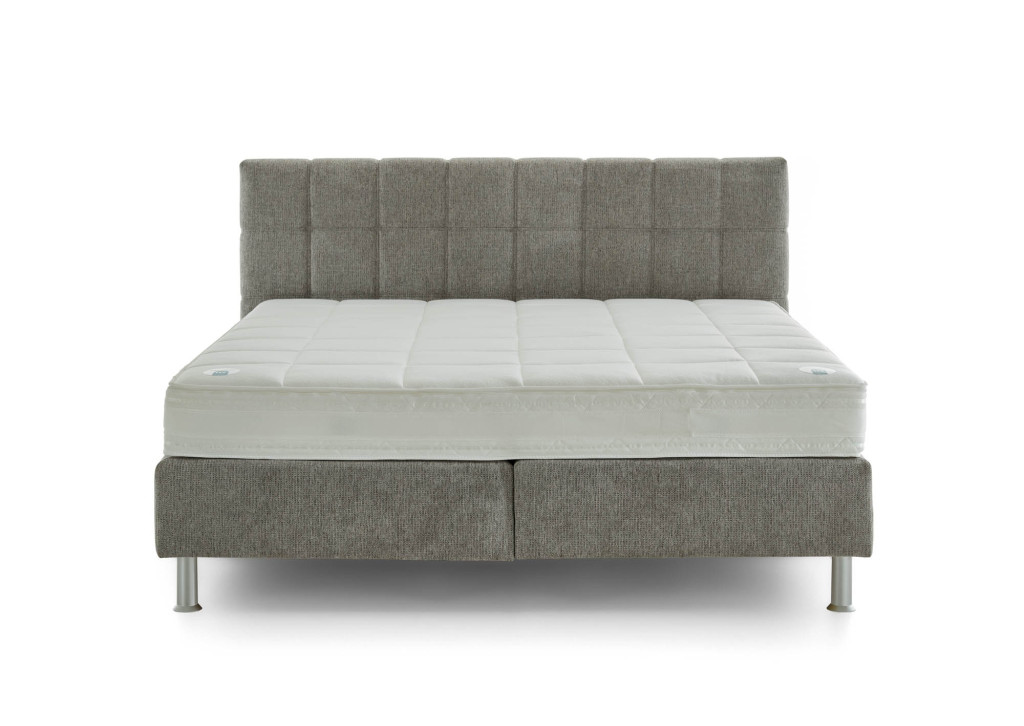 Stoff Famosa (PG3), Farbe stone, Füße Kunststoff alufarbig, 15 cm (K01-15), Kopfteil 0696M (109 cm), Rücken unecht, Unterbau Luxury Bonellfederkern, Matratze links 5-Zonen-Taschenfederkern-Matratze MA 232 H2, Matratze rechts 5-Zonen-Taschenfederkern-Matratze MA 232 H3, Bezug Drell, im Ganzen Liegefläche 180 x 200 cm, Stellmaß BHT 194/109/215 cm, Liegehöhe 57 cm