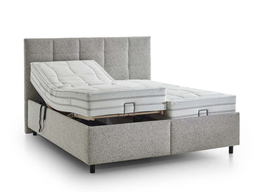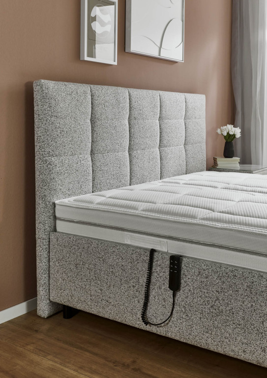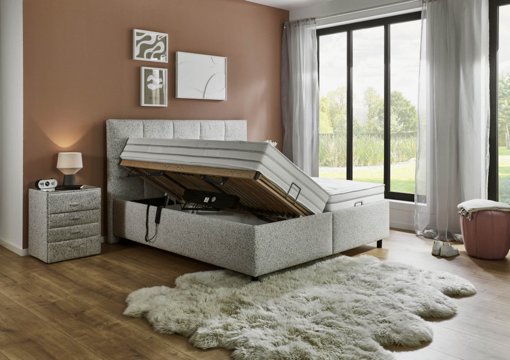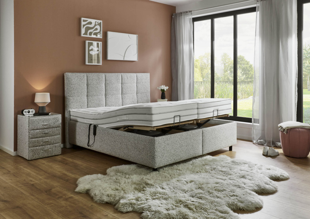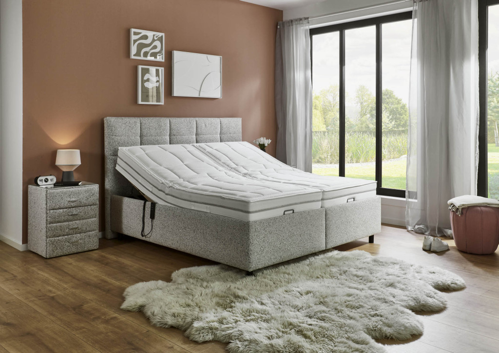 Stoff Puente (PG5), Farbe beige, Füße Schwebeoptik, 10 cm (K08-10), Kopfteil 25028 B, Rücken unecht, Unterbau BK 35, Matratze links 1000-Federn Taschenfederkern-Matratze MA 420 H2, Matratze rechts 1000-Federn Taschenfederkern-Matratze MA 420 H3, Bezug Drell, geteilt, 2x Lattenrost LR28 QM mit motorischer Queröffnung. Liegefläche 180 x 200 cm, Stellmaß BHT 191/125/215 cm, Liegehöhe 62 cm