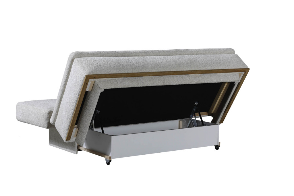 Erleben Sie höchsten Komfort und stilvolles Design mit diesem eleganten Schlafsofa in hellcremer Stoffausführung. Der hochwertige Federkern in Sitz und Rücken sorgt für angenehmen Sitz- und Liegekomfort, während die praktische Rückenautomatik das Verwandeln in eine großzügige Liegefläche erleichtert. Die stabilen Rollenfüße ermöglichen ein müheloses Verschieben, und der integrierte Bettkasten bietet zusätzlichen Stauraum für Decken und Kissen. Dieses Schlafsofa vereint Funktionalität, Qualität und zeitlose Eleganz – die perfekte Wahl für Ihr modernes Wohnambiente.