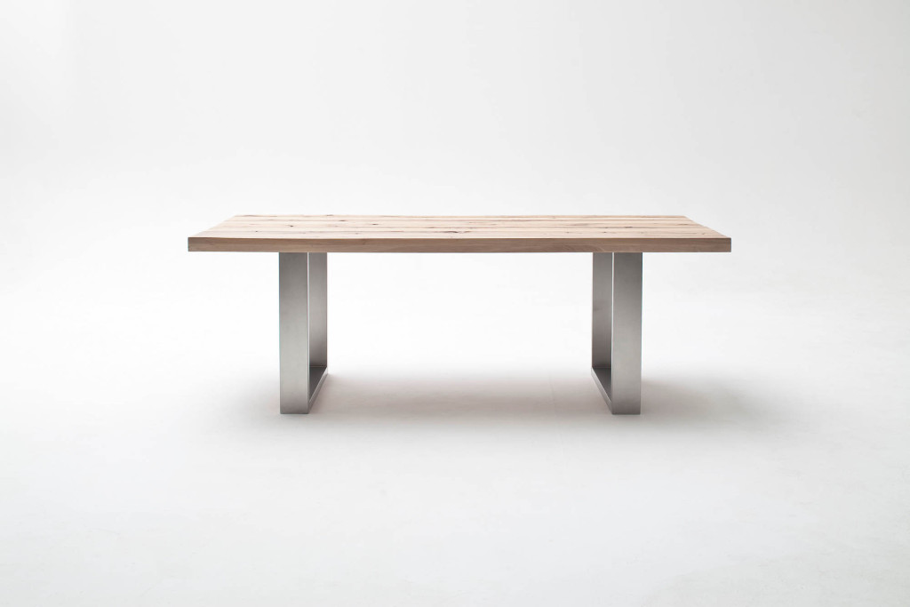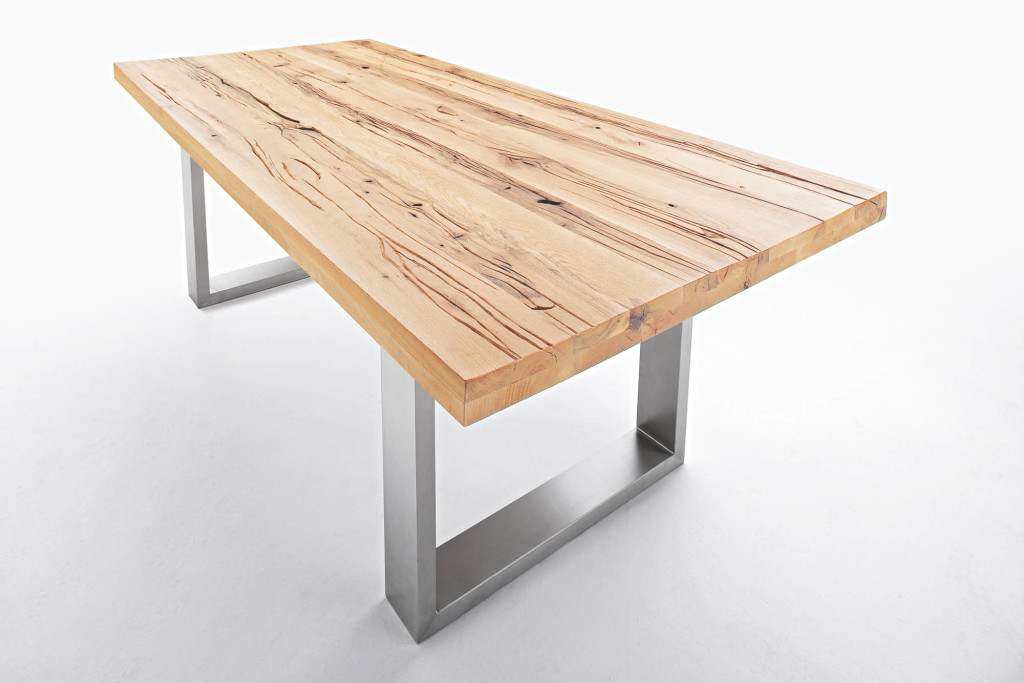 Zerreiche, Kufentisch, Tischplatte Zerreiche mit Gebrauchsspuren lackiert, Plattenstärke ca. 60 mm aufgedoppelt, Gestell Edelstahl gebürstet 120x40mm, Flächenbelastung 90 kg, TP Individuelles Einzelstück, in Handarbeit gefertigt, LBH ca. 180/100/76 cm