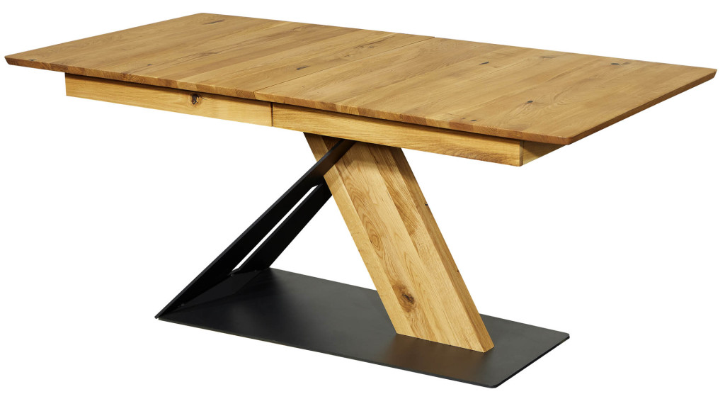 Balkeneiche massiv durchgehende Lamelle, Wildeiche geölt, Tischplattenstärke ca. 25mm nach unten abgeschrägt, 1 Einlegeplatte 50 cm, Metallsäule und Bodenplatte anthrazit gepulvert, mit Synchronauszug, LBH ca. 180(230)/90/77 cm