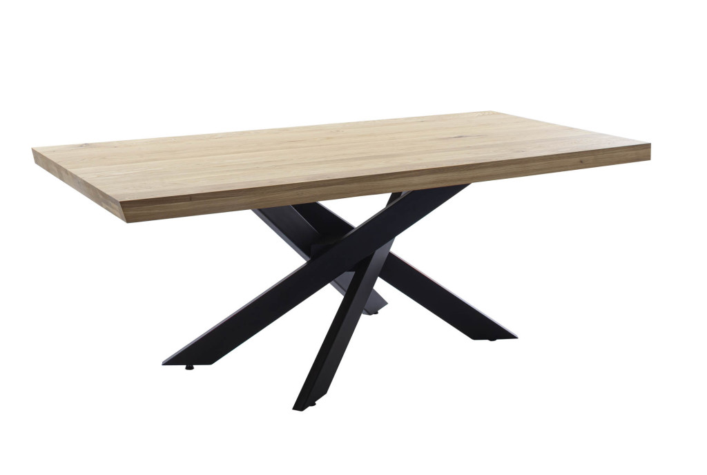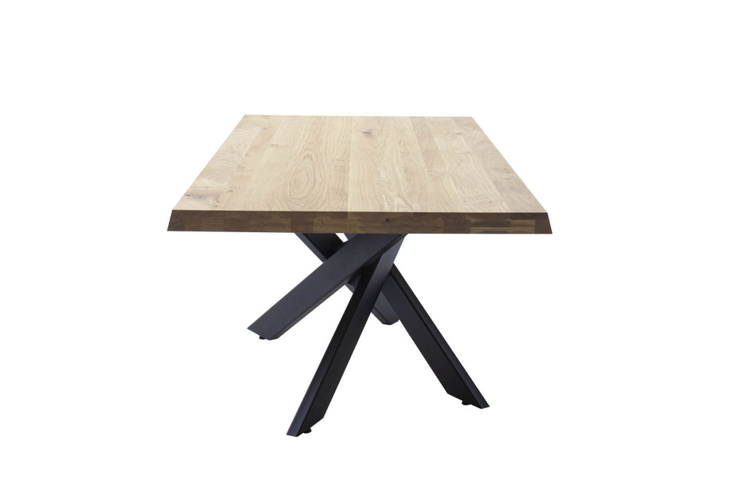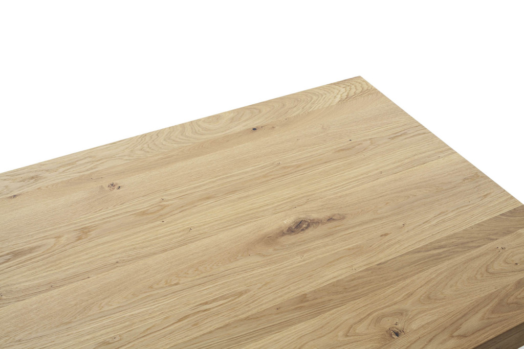 Platten Wildeiche massiv geölt, durchgehende Lamelle, mit wechselnder schweizer Kante, aufgedoppelt auf ca. 6 cm, 3 versch. Breiten, Mikado-Gestell Metall schwarz