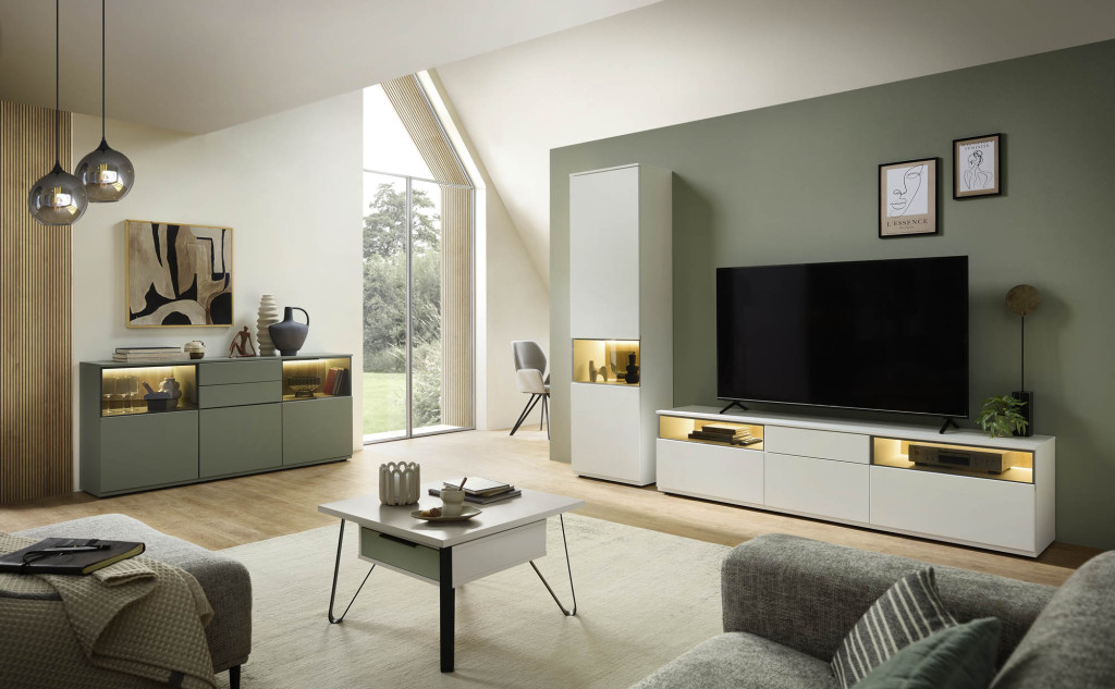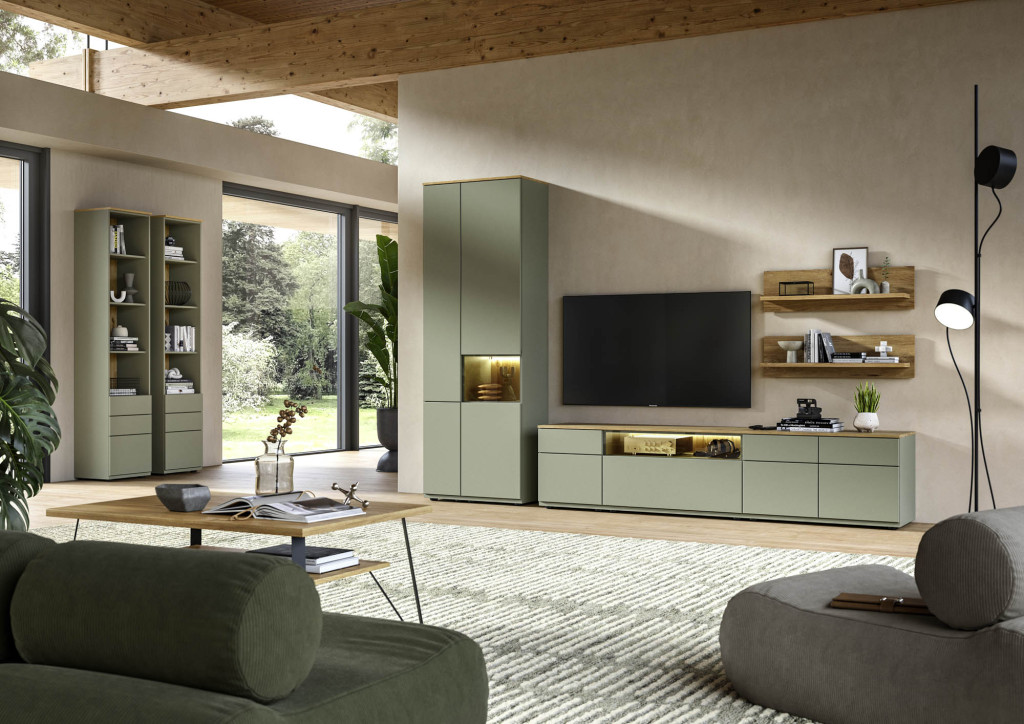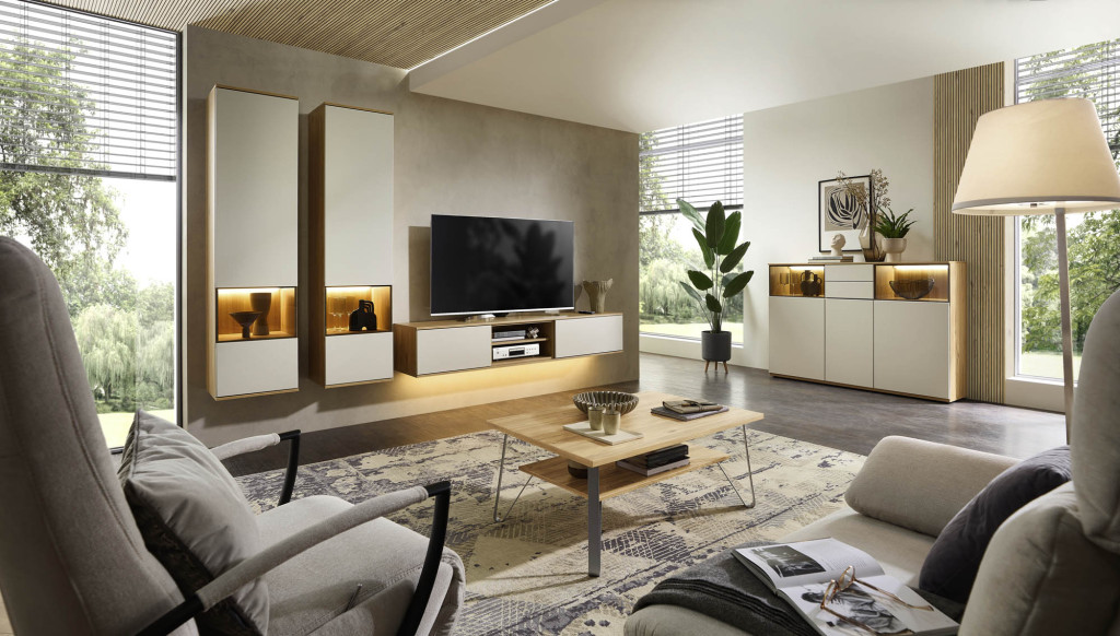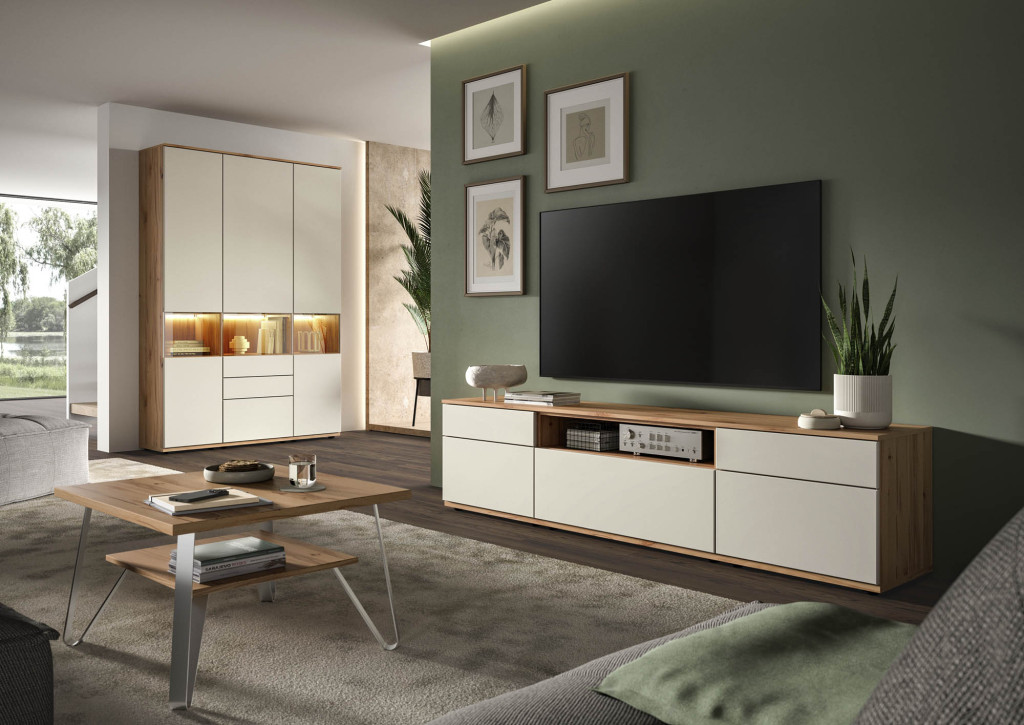 Die Wohnwand in edler Risseiche-Nachbildung überzeugt durch ihr harmonisches Design und die moderne Farbgebung in Sandbeige matt. Sie bietet großzügigen Stauraum und präsentiert sich als eleganter Blickfang in jedem Wohnraum. Hochwertige Materialien und eine sorgfältige Verarbeitung gewährleisten Langlebigkeit und Stabilität. Die Kombination aus offenen und geschlossenen Elementen ermöglicht eine individuelle Gestaltung und schafft Platz für Dekoration sowie Multimedia-Geräte. Diese Wohnwand verleiht Ihrem Zuhause eine warme, stilvolle Atmosphäre und vereint Funktionalität mit zeitloser Eleganz – ideal für ein anspruchsvolles Wohnambiente.