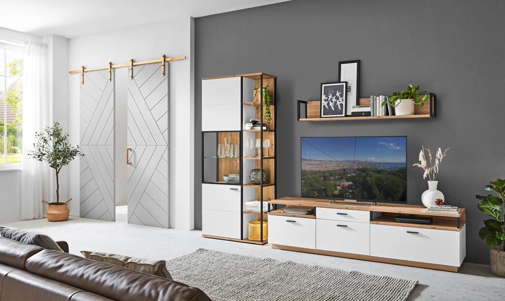 Front/Korpus Modern white Melamin, Absetzung Eiche Artisan Melamin, Metall pulverbeschichtet schwarz, sichtbare Rückwände Eiche Artisan, Kombi bestehend aus: 15 - Vitrine, 1 Glastür, BHT ca. 90/206,2/37,4 cm 31 - Wandboard, 1 Paneel, 1 Holzboden, BHT ca. 150/24/25 cm 27 - Unterteil, 2-türig, 2 Schubkästen, 2 Fächer, BHT ca. 204,3/55,4/50 cm Gesamtmaß BHT ca. 304,3/206,2/50 cm