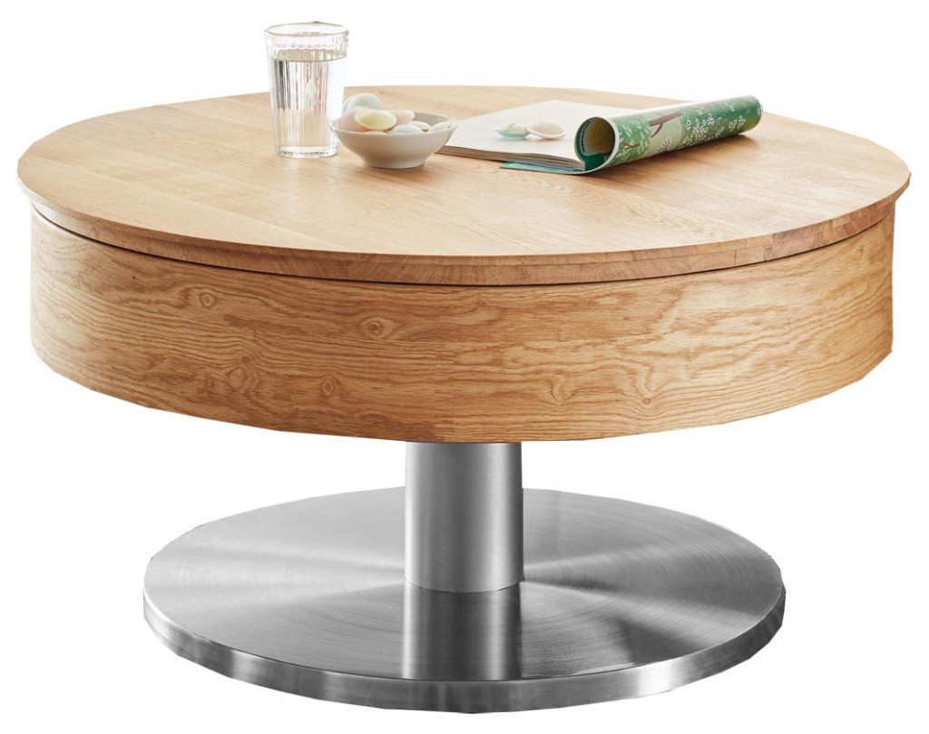 Top Asteiche furniertes Schichtholz, geölt, Deckplatte drehbar mit Innenfach, Säule Edelstahl-Optik gebürstet, Sockelplatte MDF ummantelt mit Metall + Rollen, in Edelstahl-Optik, gebürstet, Belastbarkeit bis maximal 15 kg, DH ca. 79/40 cm