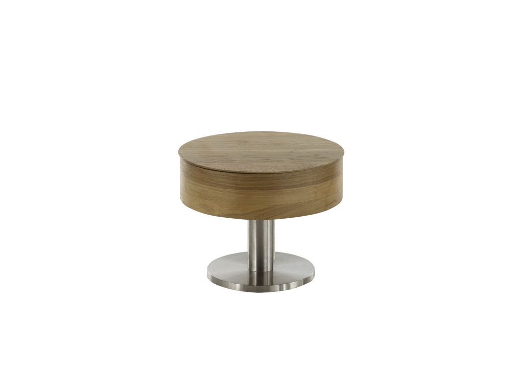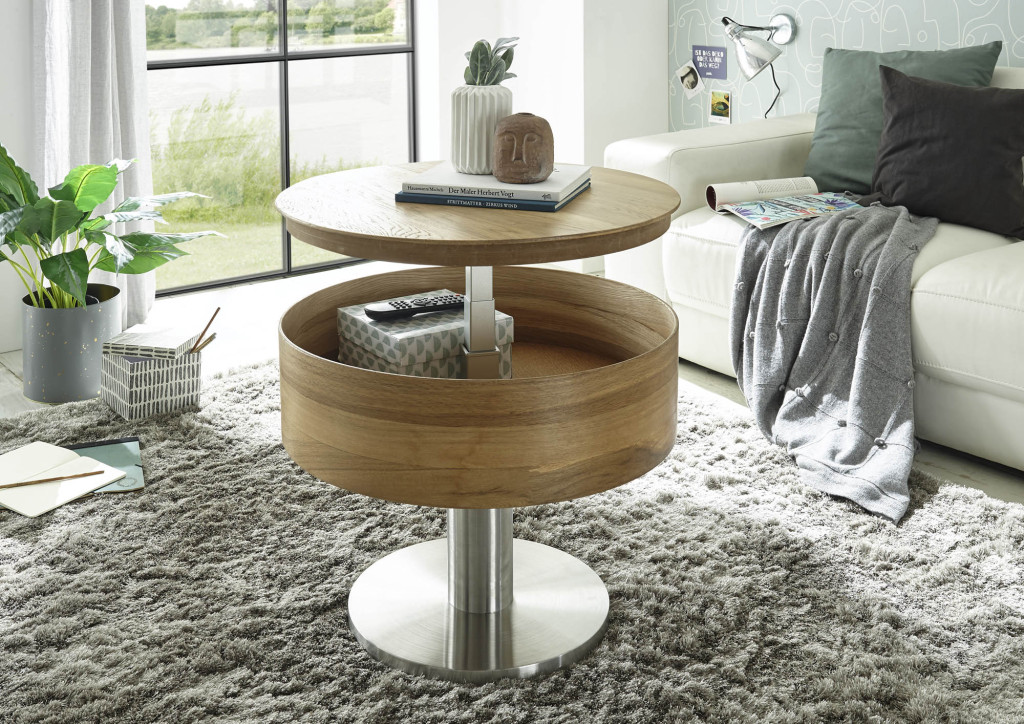rund 60 cm, Asteiche furniert Schichtholz und Spanplatte, geölt, Kastenhöhe ca. 17 cm, Gestell Metall Edelstahl-Optik, Höhe 47 cm, stufenlose Höhenverstellung bis 65 cm, Belastbarkeit bis maximal 15 kg, Rollen unter der Bodenplatte, DH ca. 60/47 cm