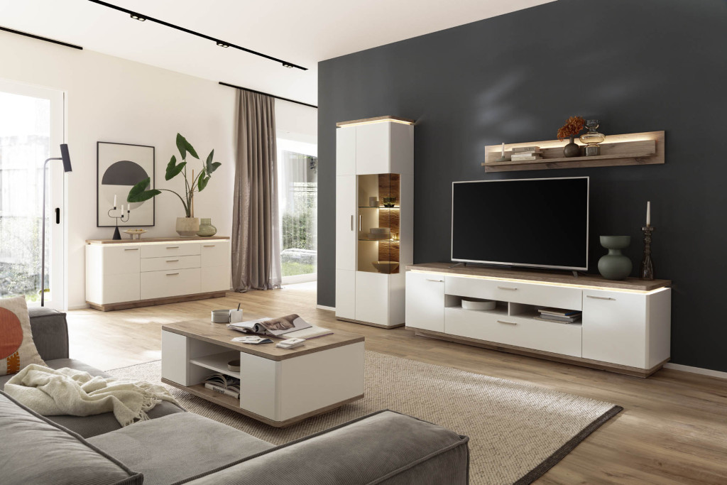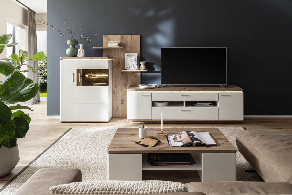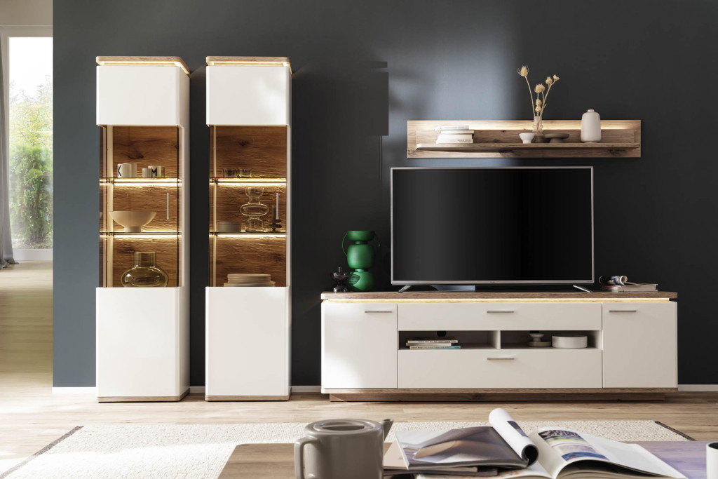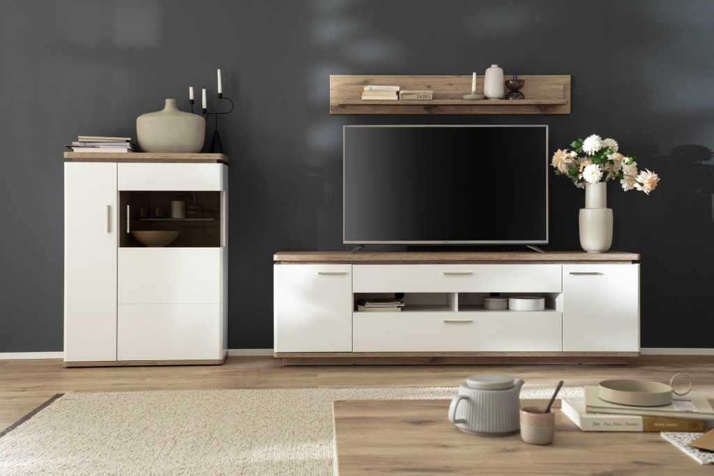 Front Soft white tiefgezogen Nachbildung, Korpus Soft white Melamin Nachbildung, Korpusabsetzung Viking Oak Melamin Nachbildung, Seitenverglasung Parsol braun, Glasböden Klarglas, Rückwand sichtbar 3D Viking Oak Nachbildung geschroppt, Rückwand hinter Türen + Schubkästen Soft white Nachbildung, Griffe Metall nickel matt, Schubkasten Unterflurführung gedämpft, Kombination W02 bestehend aus: T12 - Kombi-Vitrine, 2-türig, 1 Tür mit Glas, LED Beleuchtung Oberboden inklusive, Seitenverglasung rechts, BHT ca. 75/208/38 cm T30 - TV-Element, 2-türig, 2 Schubkästen, 2 Fächer, BHT ca. 210/65/50 cm T50 - Wandboard, 1 Paneel, 1 Boden, BHT ca. 150/24/19 cm Gesamtmaß BHT ca. 295/208/50 cm