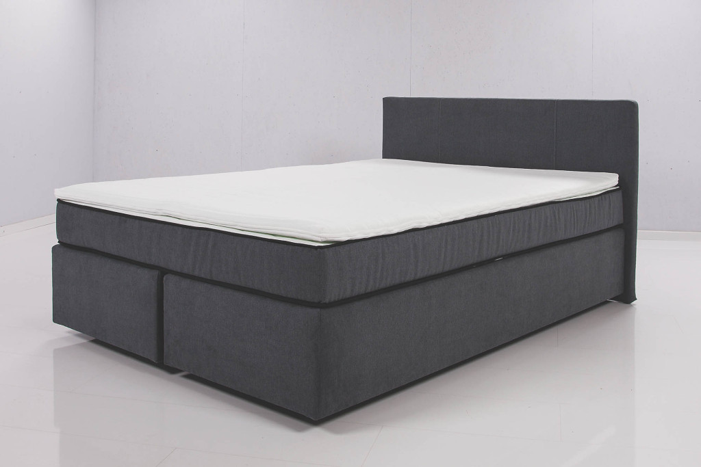Exklusiv Alliance - Boxspringbett 140x200cm, Bezug 1914 blau/grau, glatt gepolstertes Kopfteil/Boxen in Möbelstoffbezug, mit einer 14 cm hohen Comfortschaumabdeckung, 4-Gang-Bonellfederkernmatratzen mit Doppeltuchbezug/Border aus Möbelstoff, inklusive Topper Simply mit 4cm Schaum, abnehmbar/waschbar 60°