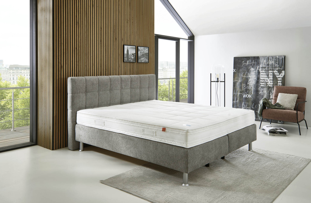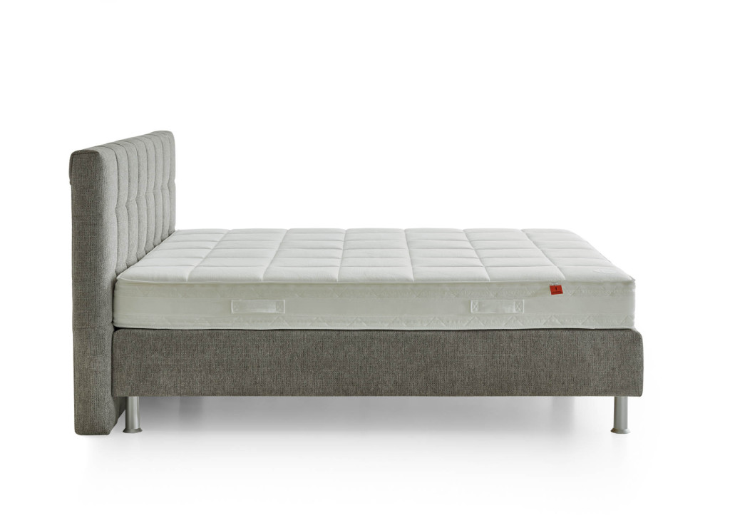 Stoff Famosa (PG3), Farbe stone, Füße Kunststoff alufarbig, 15 cm (K01-15), Kopfteil 0696M (109 cm), Rücken unecht, Unterbau Luxury Bonellfederkern, Matratze links 5-Zonen-Taschenfederkern-Matratze MA 232 H2, Matratze rechts 5-Zonen-Taschenfederkern-Matratze MA 232 H3, Bezug Drell, im Ganzen Liegefläche 180 x 200 cm, Stellmaß BHT 194/109/215 cm, Liegehöhe 57 cm
