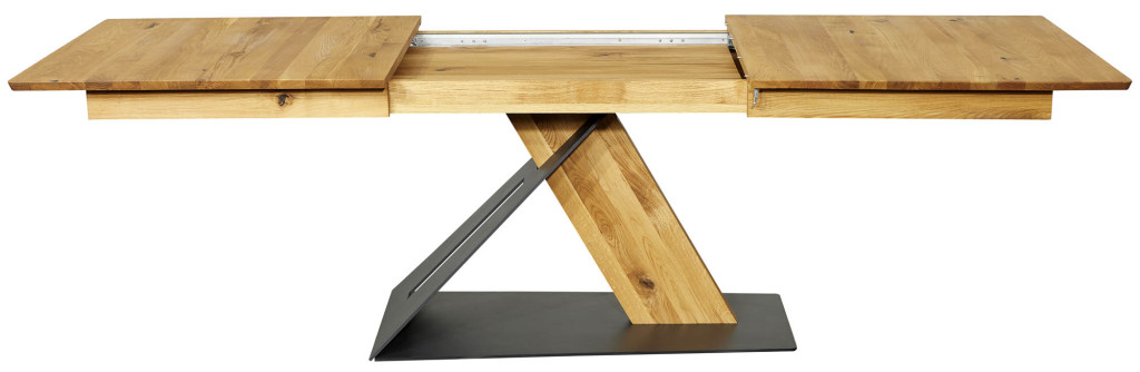 Balkeneiche massiv durchgehende Lamelle, Wildeiche geölt, Tischplattenstärke ca. 25mm nach unten abgeschrägt, 1 Einlegeplatte 50 cm, Metallsäule und Bodenplatte anthrazit gepulvert, mit Synchronauszug, LBH ca. 180(230)/90/77 cm