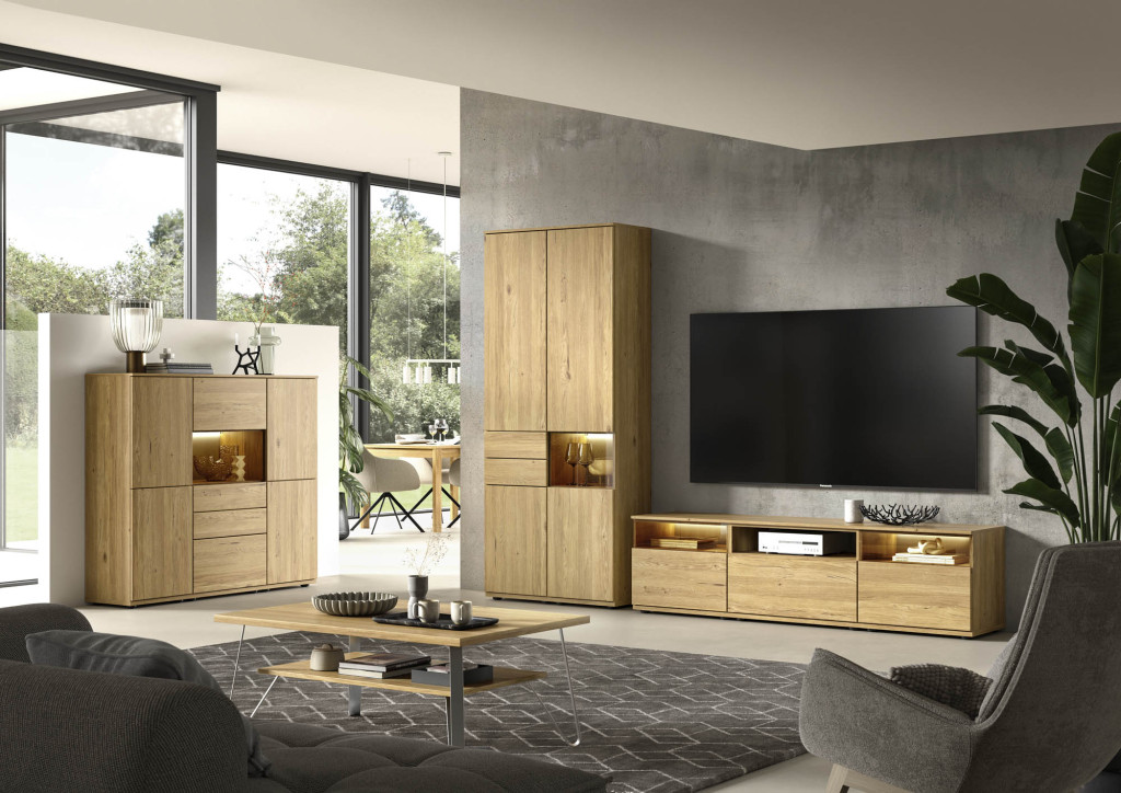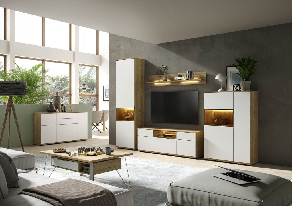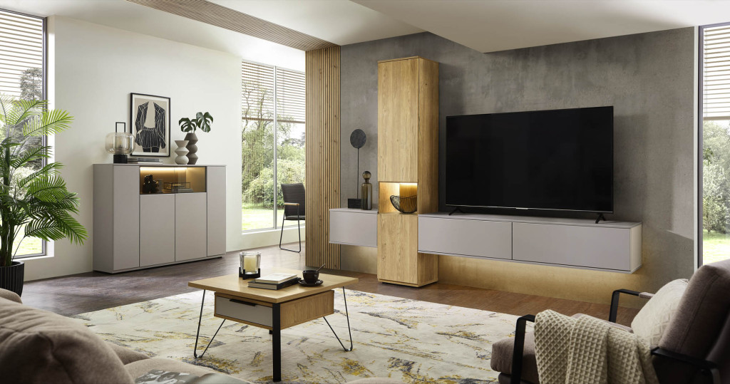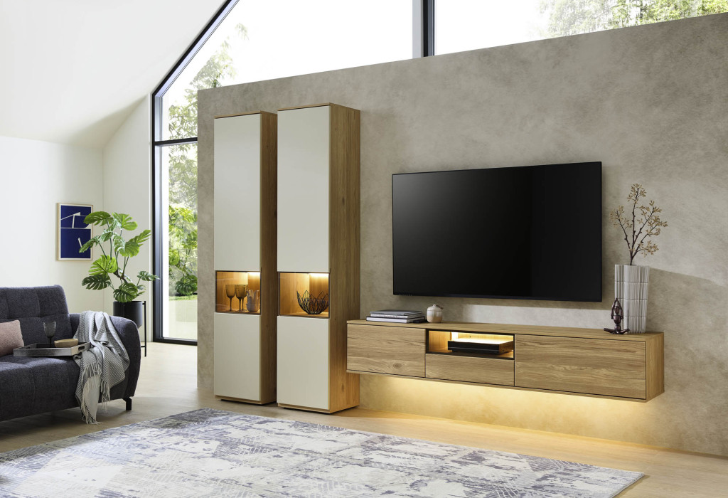 Die Wohnwand in edler Risseiche-Nachbildung überzeugt durch ihr harmonisches Design und die moderne Farbgebung in Sandbeige matt. Sie bietet großzügigen Stauraum und präsentiert sich als eleganter Blickfang in jedem Wohnraum. Hochwertige Materialien und eine sorgfältige Verarbeitung gewährleisten Langlebigkeit und Stabilität. Die Kombination aus offenen und geschlossenen Elementen ermöglicht eine individuelle Gestaltung und schafft Platz für Dekoration sowie Multimedia-Geräte. Diese Wohnwand verleiht Ihrem Zuhause eine warme, stilvolle Atmosphäre und vereint Funktionalität mit zeitloser Eleganz – ideal für ein anspruchsvolles Wohnambiente.