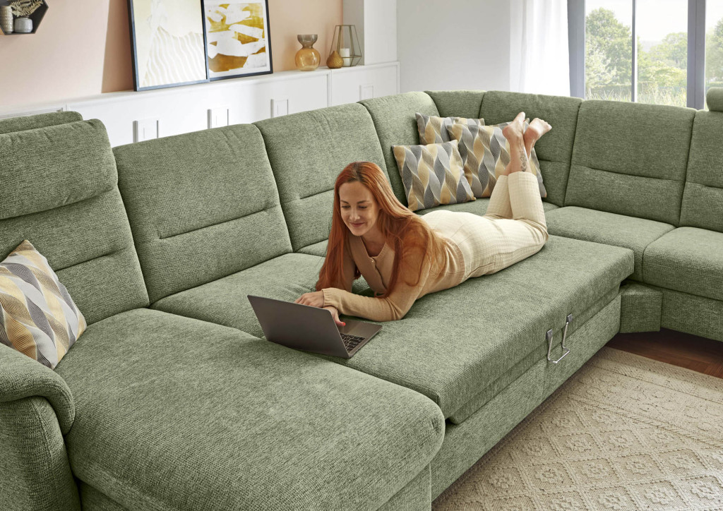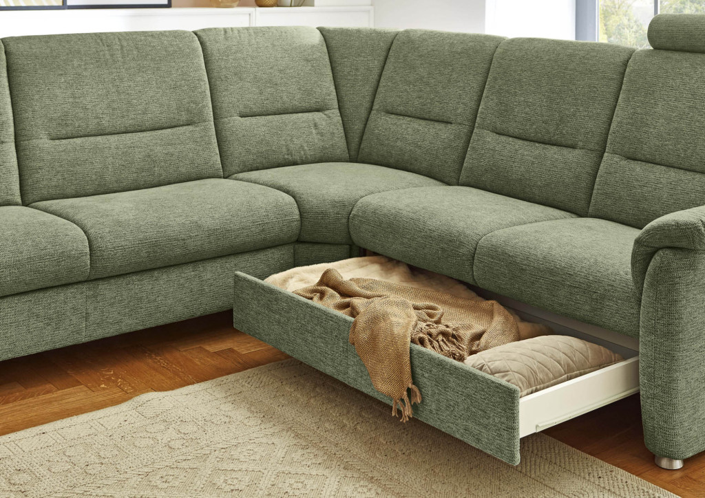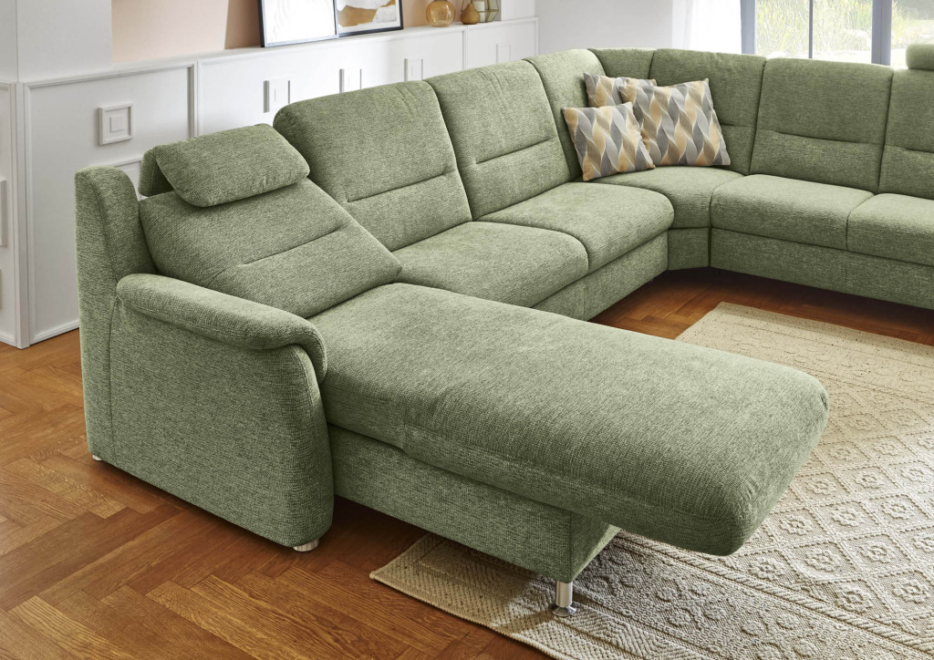 Stoff Mads (SPG 10), Farbe lind, Rücken Nessel, Sitz Super-Bonell-Federkern, Metallfuß alufarbig, Sitzhöhe 46 cm, bestehend aus: CanL - Canape, Armlehne links, Rücken echt 2,5EL - 2,5-Sitzer Zwischenelement, ohne Armlehnen RE - Rundecke, Rücken echt 2R - 2-Sitzer, Armlehne rechts, Rücken echt Stellmaß 242/337/169-205cm