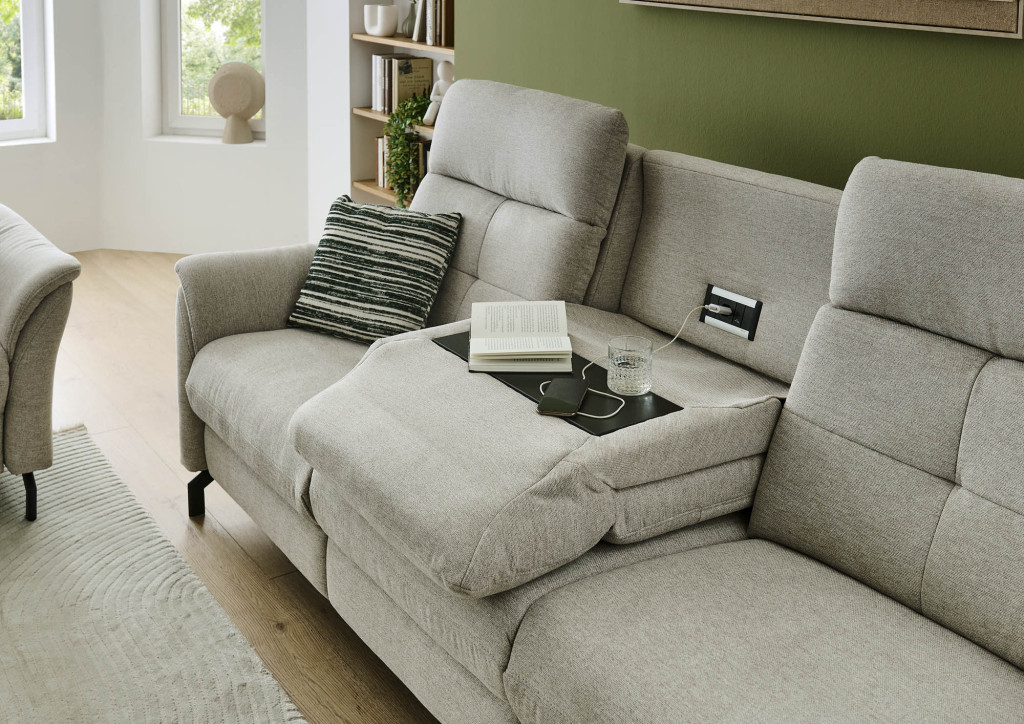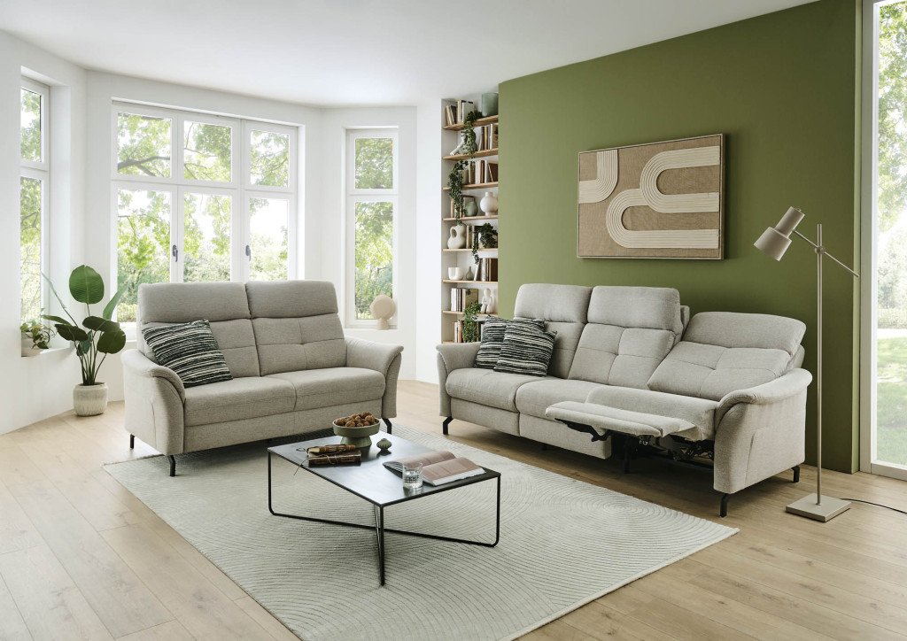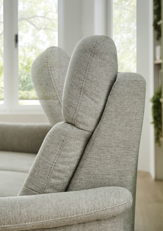Stoff Asina (PG 12), Farbe beige, Kappnaht ohne Kontrast, Sitz Federkern, Metallfuß schwarz, Sitzhöhe 46 cm, Sitztiefe 54 cm, mit Kopfteilverstellung bestehend aus: 2,5KV - 2,5-Sitzer, BHT 174/104/93 cm 3TXWKV - 3-Sitzer, Rücken unecht, BHT 241/104/93 cm
